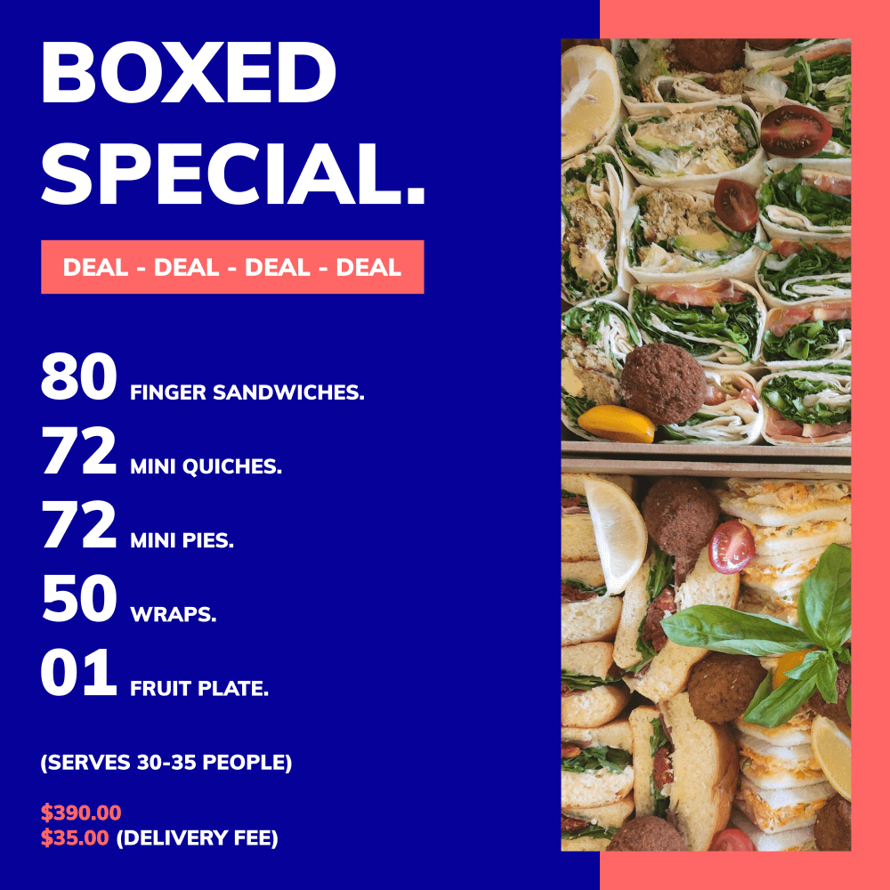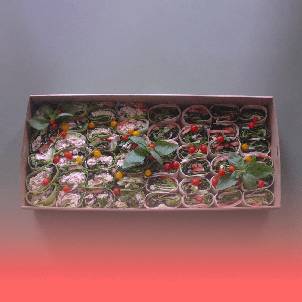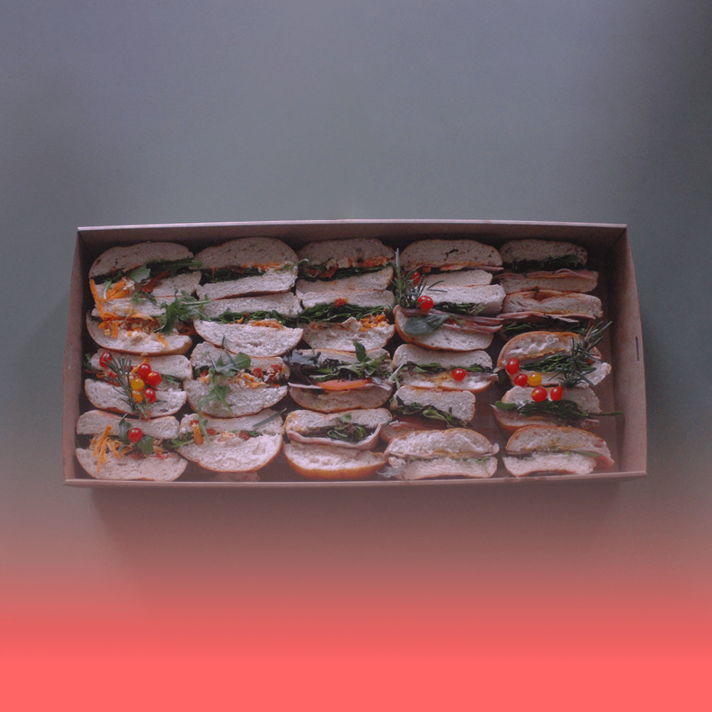 THIS BOX CONTAINS A MIX OF: CHICKEN/AVOCADO/SWISS CHEESE/ROCKET/AIOLI, HAM/DIJON MUSTARD/MIXED LEAVES/TOMATO/SWISS CHEESE, SMOKED SALMON/DILL/CREAM CHEESE/LETTUCE/CAPERS AND FALAFEL/HUMMUS/PICKLES/MIXED LEAVES.