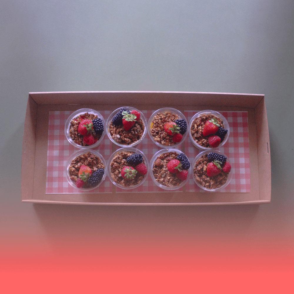THIS BOX CONTAINS GREEK YOGHURT AND HOUSEMADE GRANOLA WITH FRESH BERRIES ON TOP.