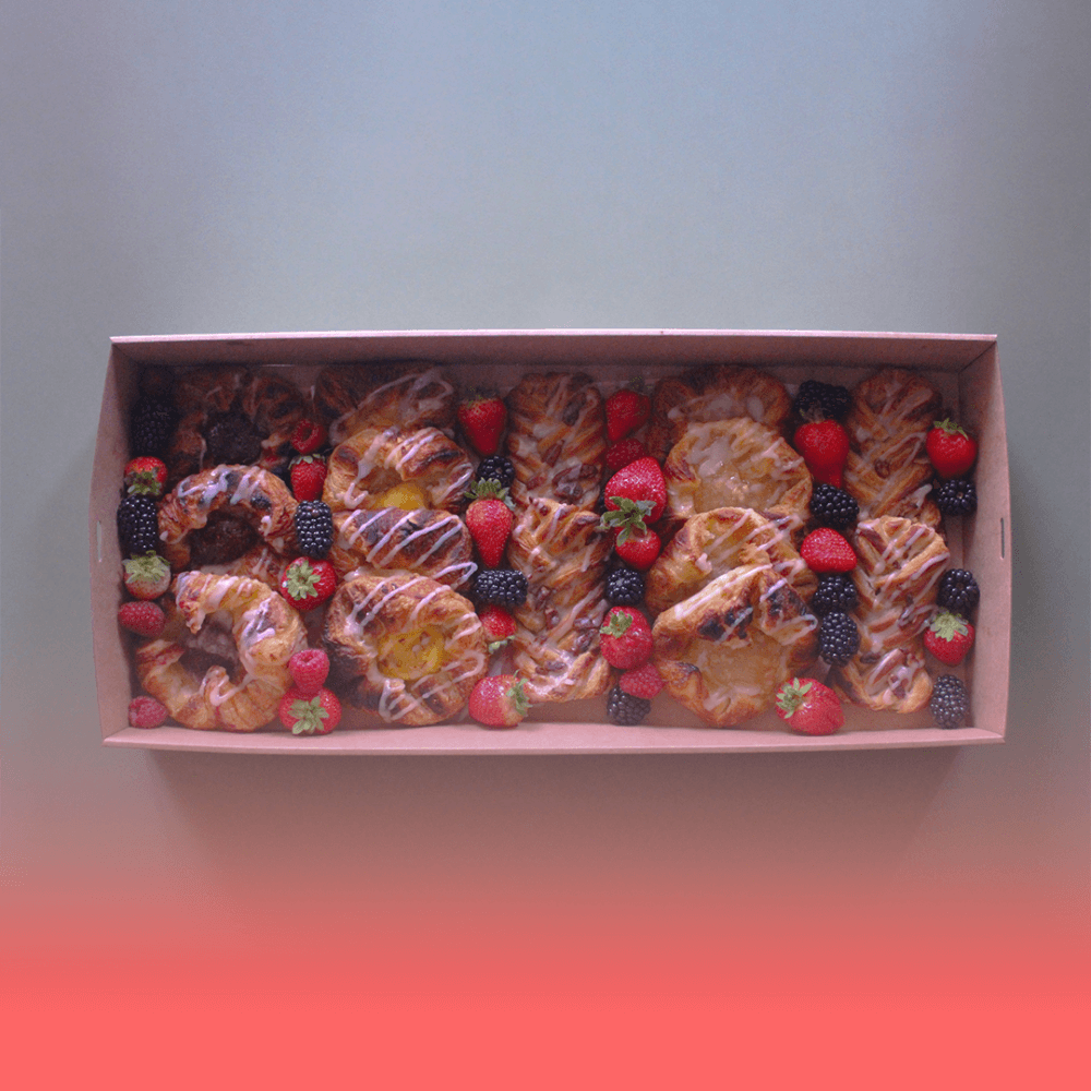 THIS BOX CONTAINS A MIX OF: PAIN AU CHOCOLAT, ALMOND LATTICE, APPLE SULTANA LATTICE, CINNAMON SWIRL, APRICOT AND CHERRY.