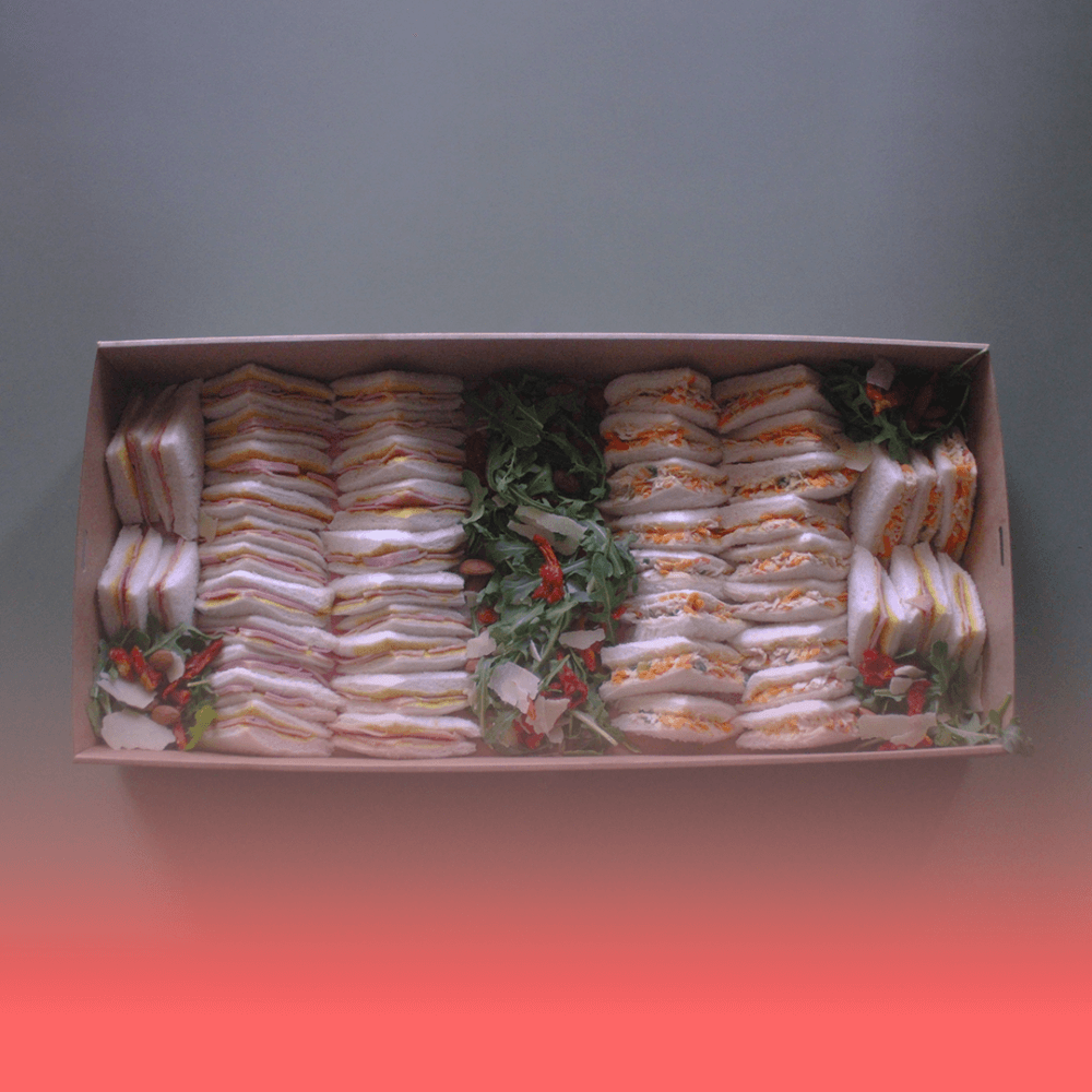 THIS BOX CONTAINS A MIX OF: CHICKEN/CHIVES, EGG/AVOCADO, CUCUMBER/CREAM CHEESE AND HAM/SWEET CHILLI MUSTARD.
